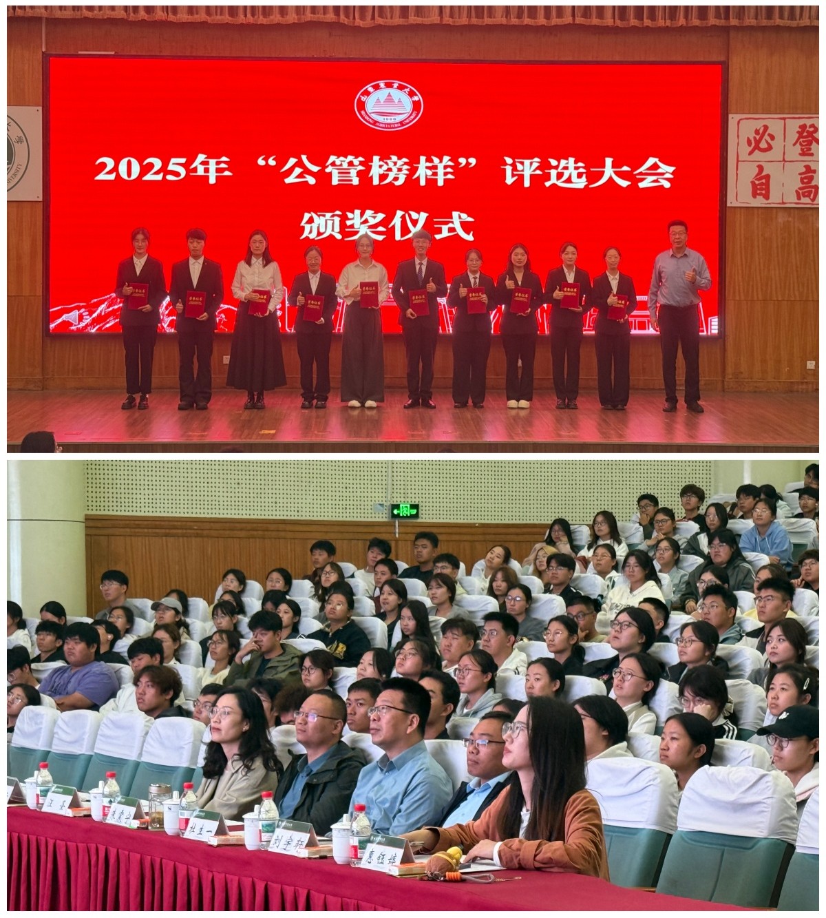 答辩结束后,学院教师和学生代表对候选人进行综合投票打分,10名学生荣获2025年“公管榜样”荣誉称号,5名同学获得2025年“公管榜样”提名奖荣誉称号,学院党委副书记朱震宁为2025年“公管榜样”获得者颁发荣誉证书。
