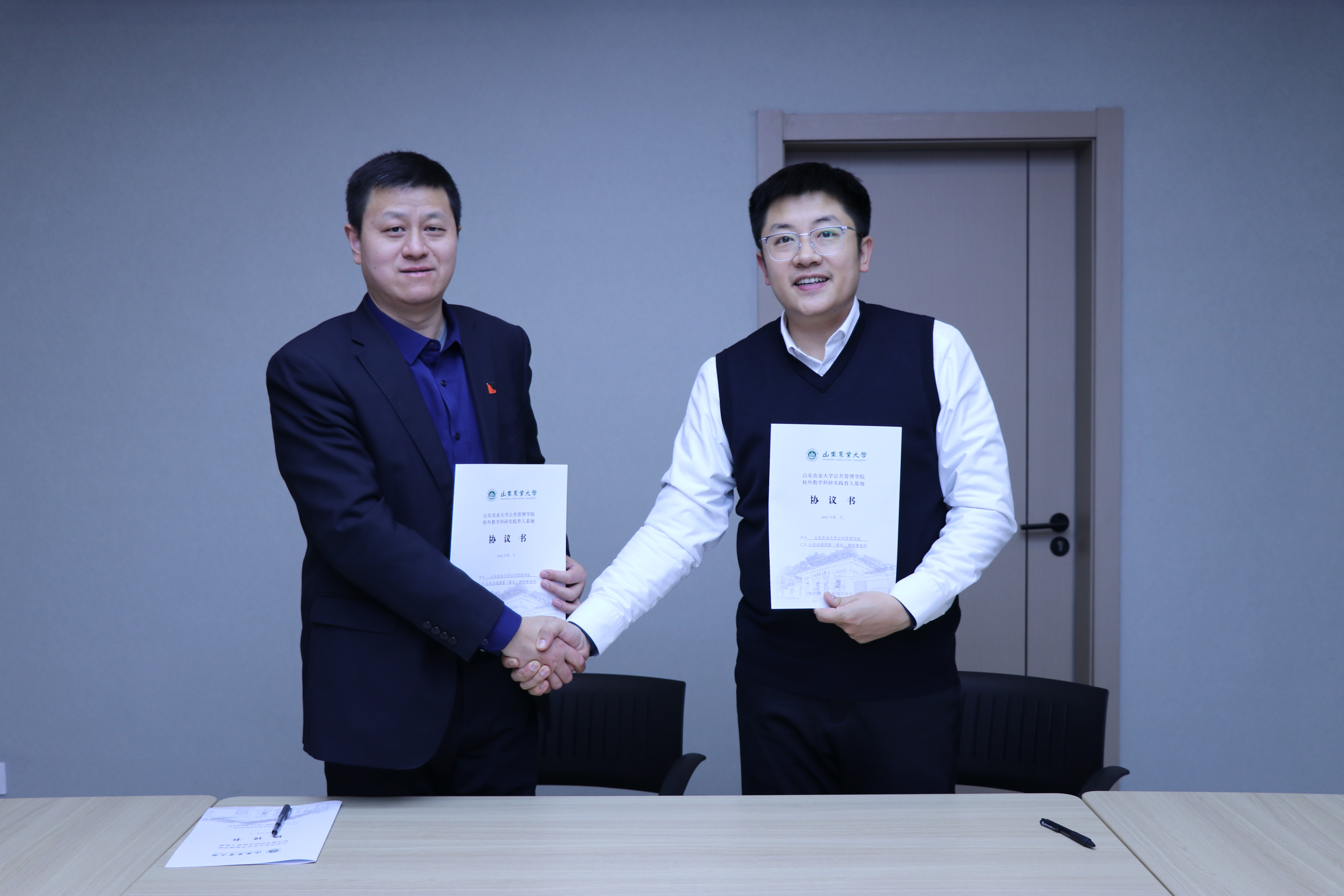 学院副院长杨瑞与众成清泰(泰安)律师事务所副主任郭长满代表双方签署校外教学科研实践育人基地合作协议。