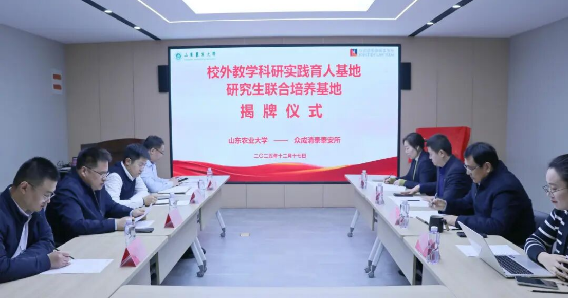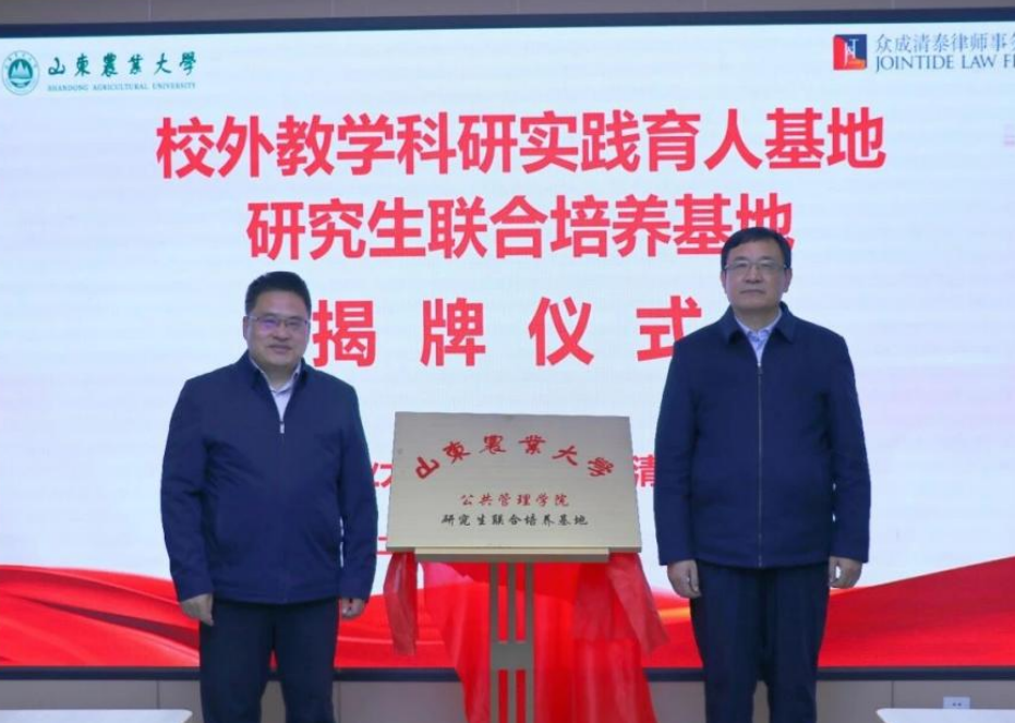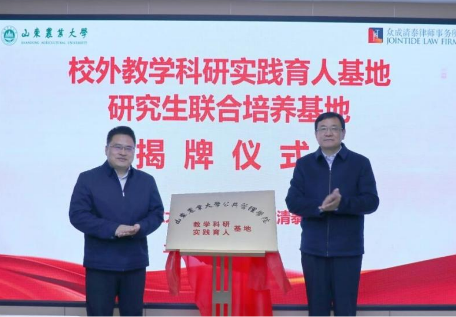 2025年12月17日,学院与山东众成清泰(泰安)律师事务所举行揭牌仪式,共建校外教学科研实践育人基地与研究生联合培养基地。公共管理学院党委副书记、院长徐宣国、副院长杨瑞以及法学系教师参加活动。