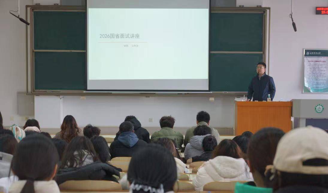 在考研复试指导讲座中,主讲教师围绕复试流程、面试礼仪、综合问答技巧及调剂策略等内容进行了系统讲解,帮助学生明确复习重点、科学制定备考计划,有效增强了复试应对能力。考公面试讲座则以结构化面试、无领导小组讨论等形式为核心,结合最新政策要求和岗位特点,深入分析面试测评要素,对学生在岗位认知、答题逻辑、表达技巧等方面存在的共性问题进行了针对性指导。学院紧抓研后关键时期,为毕业生提供更多就业选择,进一步拓宽就业渠道。