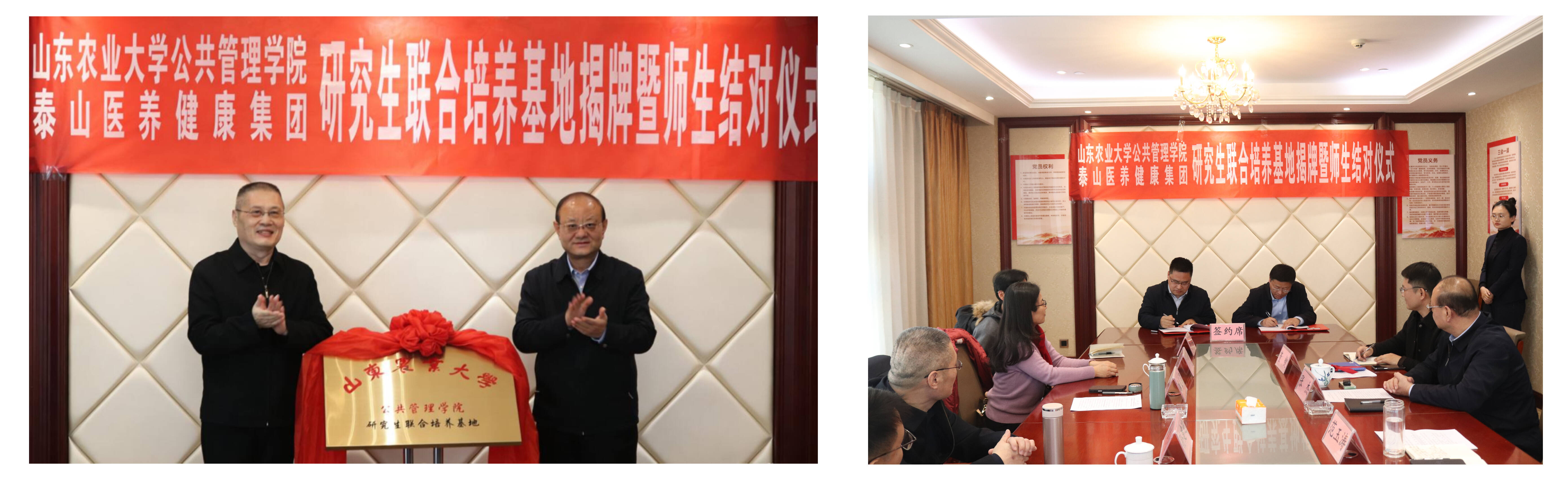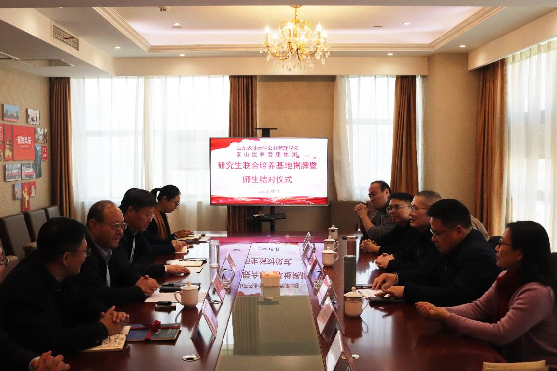 2026年1月7日,公共管理学院与泰安市泰山医养健康集团有限公司举行研究生联合培养基地揭牌暨师生结对仪式。公共管理学院党委书记孙建迎以及党委副书记、院长徐宣国和农村发展专业学位点教师参加活动。