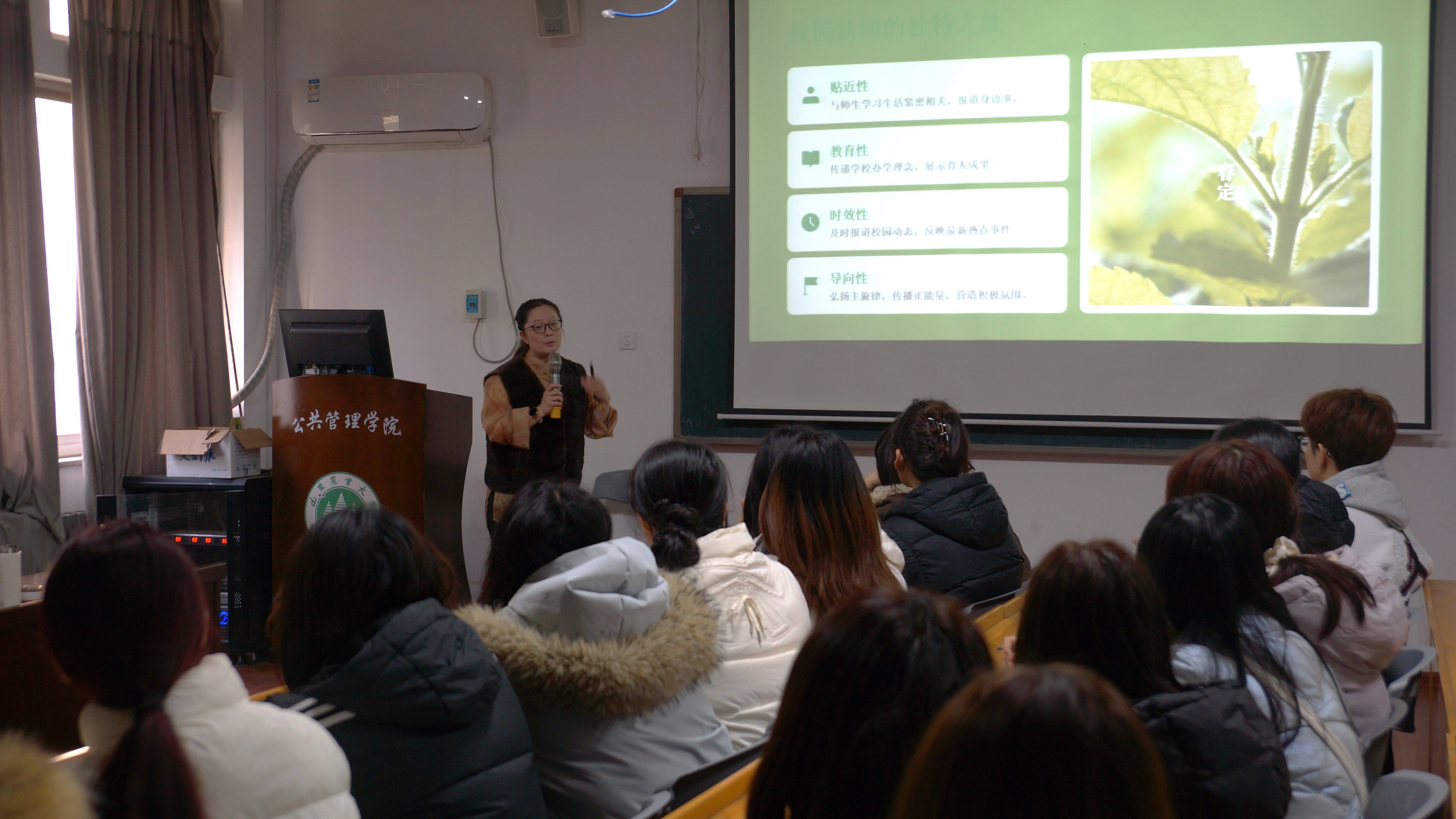 朱凌老师结合典型案例开展业务培训,系统讲解了新闻写作的叙事逻辑、摄影构图的视觉表达及新媒体平台运营策略。她表示,新媒体时代下,新闻宣传员需深耕日常工作一线,敏锐捕捉平凡中的闪光点,通过专业精准、富有感染力的报道,生动展现公管师生在“冲一流”征程中的担当作为。