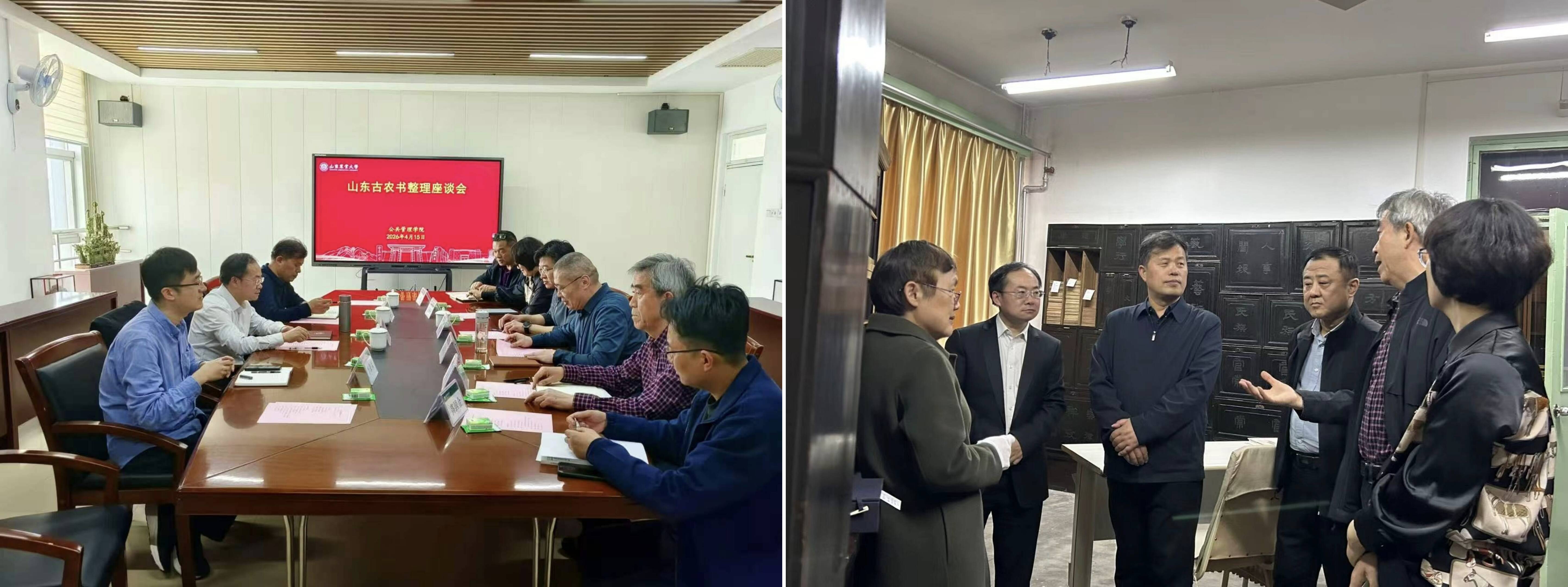 4月15日,山东省方志馆馆长乔士华、副馆长管士进、编辑李果霖一行到访公共管理学院,双方围绕深化校馆合作、提升山东省农书整理传承研究工作专业化与规范化水平、推动农业历史文化遗产保护与活化利用等议题开展座谈交流。社会科学处处长董岳,公共管理学院党委书记孙建迎、副院长王秀鹃,以及孙金荣、丁建川、高国金等相关领域专家学者出席座谈会。会上,孙金荣教授等结合自身研究经验,就农书整理的学术规范提出专业建议。双方依托山东农业大学在农业历史研究领域的学科积淀、人才优势及馆藏资源,围绕农书校勘、辑佚、数字化保护及科学研究等关键问题深入研讨,明确了后续校馆协同发力、资源共享的合作方向。